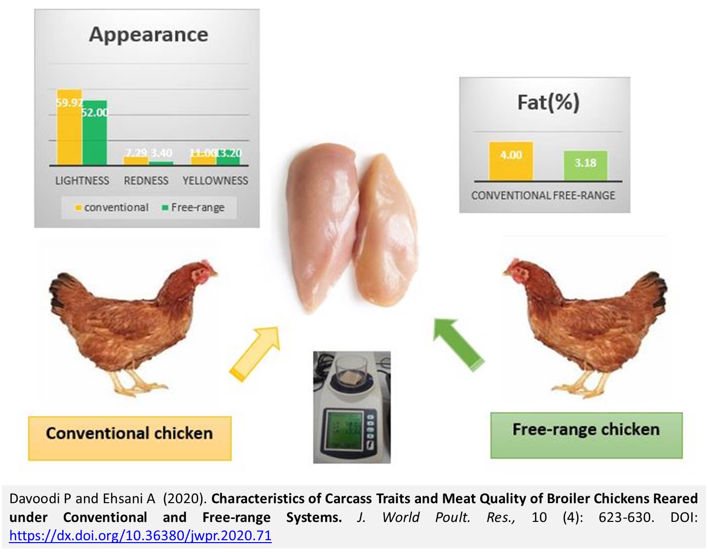 ABSTRACT: Alternative chicken production systems have become popular in recent years due to animal welfare criteria and consumer’s perceptions. General beliefs express that the meat quality of chicken reared under free-range systems is better than that of chickens under conventional production conditions. The aim of this study was to compare the meat quality and carcass traits of chickens raised in conventional and free-range systems. Either conventional or free-range systems used meat-type Hubbard JA57 birds with a slaughter age of approximately 78 days. For assessing carcass traits and meat quality, six male chickens were selected from each system. The meat quality parameters, pH at 45 minutes, ultimate pH, color coordinates, drip loss, cooking loss, and water-holding capacity were measured. Furthermore, proximate parameters, such as crude protein, total fat, and crude ash were determined. There were no significant differences in main carcass yield and breast muscles between chickens reared in two systems, however, color values dramatically were influenced by rearing systems. Breast muscle samples from birds reared under the conventional system had a smaller hue angle and saturation value than those from the free-range birds. Moreover, the drip loss parameter was significantly higher in free-range chickens. The ash and protein contents of breast muscles were similar although raw breast meat from free-range birds had significantly lower fat content. The results prove that a free-range rearing system can modify the appearance, color values, and fat content of chicken meat and it can be a part of the interests of meat production consumers.