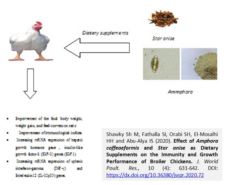 ABSTRACT: The present study was designed to evaluate the impacts of daily dietssupplemented with Amphora coffeaeformis and Star anise on growth performance and immunity of Cobb broiler chickens. Amphora coffeaeformis is considered a potent free radical scavenger due to the presence of β-carotene and fucoxanthin, which are used widely as food additives. Star Anise has a natural antioxidant, which can also be used for the chemo-prevention of disease occurring due to oxidative deterioration. A total of 270 broiler chickens were divided into three groups, each with three replicates of 30 birds. The control group (G1) was given the basal diet, the Amphora group (G2) received Amphora in a dose of 1g/Kg in the ration, and the Star anise group (G3) received Star anise in a dose of 2g /Kg in the ration. The results indicated that Amphora and Star anise significantly improved the final body weight, weight gain, and feed conversion ratio, total white blood cells count, phagocytic activity percentage, phagocytosis index in plasma, IgM, IgG, and A/G ratio in serum. In addition, Amphora and Star anise significantly increased mRNA expression of hepatic growth hormone gene, insulin-like growth factor-1 (IGF-1) genes (IGF1), and mRNA expression of splenic interferon-gamma (INF-γ) and Interleukin 12 (IL-12p35) genes from broiler chickens, compared to the control group. In conclusion, the use of fed additives, such as Amphora coffeaeformisand Star anise in the diet of broiler chickens for 35 days was sufficient to improve broiler growth performance and could modulate their immunity.