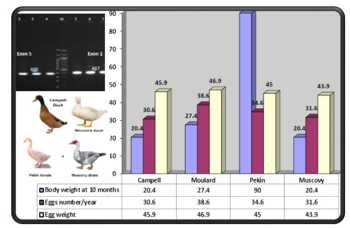 ABSTRACT: In avian, the prolactin hormone triggers and regulates ovarian follicle development. This study aims to detect the Prolactin (PRL) gene polymorphisms (exons 1and5) in four Egyptian duck breeds, namely Campbell, Moulard, Muscovy, and Pekin using PCR-RFLP technique and sequence analysis. It also investigated the association of this gene with egg production, egg weight, and body weight. The present results revealed that PRL gene exon 1 and part of intron 1 showed two alleles A and B (polymorphic) in each of Campbell and Moulard, however, Muscovy and Pekin had only one allele (monomorphic). The allele A was more dominant with frequencies of 0.70, 0.60, and 1.00, compared to the allele B (0.30, 0.40, and 0.00) for Campbell, Moulard, and Muscovy, respectively. For Pekin, the allele B only appeared with the frequency of 1.0. Ducks with the high frequency of allele A were superior at egg weight, compared to others. Furthermore, for PRL gene exon 5, there were two alleles G and C (polymorphic) in Campbell, Moulard, and Muscovy, however, Pekin had only one allele (monomorphic). The allele G was more dominant (0.15, 0.74, 0.0, and 0.84) than the allele C (0.85, 0.26, 1.0, and 0.15) for Campbell, Moulard, Pekin, and Muscovy, respectively. Ducks having a high frequency of allele C were superior at egg production. Furthermore, there were many single nucleotide polymorphisms (SNPs) in the sequences in all breeds. The utmost ones exist at the restriction sites of XbaI enzyme for the amplified fragment, in the promotor, exon 1 and intron 1 (T378C in intron 1), and DraI enzyme for that in exon 5 (A5871G in exon 5).