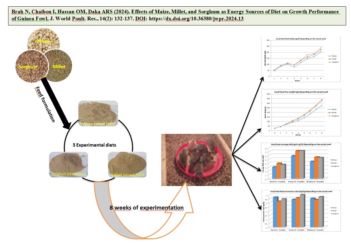 ABSTRACT: Guinea fowls are more valuable in the market in Niger than chickens; however, their ability to meet consumer demands is limited by low productivity. Therefore, suitable nutrition is an important factor for this productivity. The current study aimed to evaluate the growth performance of guinea fowl using maize, millet, and sorghum as energy sources in the diet. A total of 108 one-day-old unsexed local keets, with an average live weight of 25.5 ± 0.83 g were randomly distributed among three dietary treatments with four replicates per treatment. The keets were reared on the ground with litter at CERRA Maradi, Niger, for an 8-week experimental period, involving 36 keets per treatment and 9 keets per replication. The parameters monitored were feed intake (FI), live weight (LW), average daily gain (ADG), and feed conversion ratio (FCR). After 8 weeks of experimentation, the results indicated that the cereal used in the diet had no statistically significant effect on the keets’ FI. Those fed millet-based diets had higher LW, compared to those fed maize and sorghum diets, respectively, however, this difference was not statistically significant. Millet also facilitated a higher ADG, compared to maize and sorghum, although the differences were statistically insignificant. The keets fed sorghum-based had higher FCR, compared to the FCR of the guinea fowls fed maize and millet diet. based on the growth performance assessed in this study, the recommended order for cereals in guinea fowl feed to ensure better growth is millet, followed by maize, and then sorghum.
