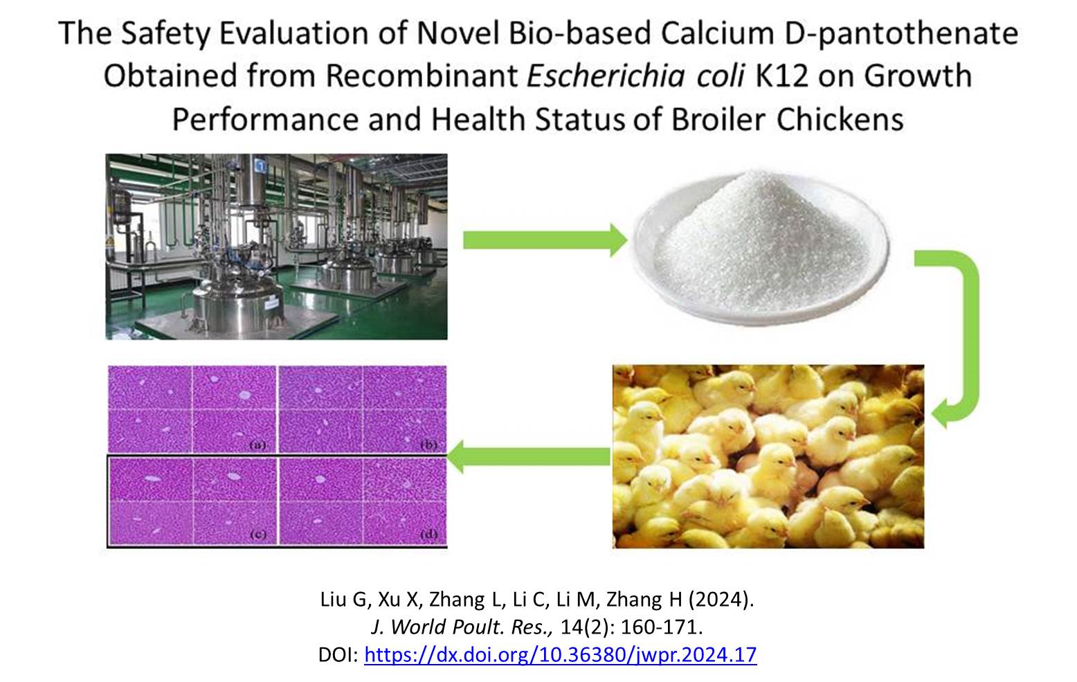 ABSTRACT: The production of traditional synthesized calcium D-pantothenate (D-PA) is accompanied with chemical pollution, therefore, the eco-friendly bio-fermentation technology has received widespread attention. In order to verify the safety of a novel D-PA product produced by genetically engineered bacteria (Escherichia coli K12), the authors of the current study investigated the influence of adding D-PA to the diet on growth performance and health status of broiler chickens. A total of 192 day-old healthy Arbor Acres broiler chickens with similar weight (43.21 ± 0.12 g) were randomly divided into 4 treatments with 6 replicates and 8 broiler chickens in each replicate (male and female in half). The Escherichia coli K12 was genetically engineered for the production of D-PA. The control group was fed with the basal diet containing 20 mg/kg synthesized D-PA (CT group). The treatments were supplemented with 20 (TCaP1 group, recommended dose group), 100 (TCaP5 group, 5-fold-dose group), and 200 (TCaP10 group, 10-fold-dose group) mg/kg bio-based D-PA product, respectively. The experiment lasted for 42 days and the growth performance and health status of broiler chickens were determined. The results indicated that the addition of 5- and 10-fold doses of bio-based D-PA could increase the average daily weight gain during 22-42 days of age and decrease the feed conversion rate during 22-42 and 1-42 days of age of broilers. There were some differences in white blood cell count, intermediate cell absolute value (MID) count, absolute granulocyte count, absolute lymphocyte count, granulocyte percentage, mean corpuscular volume, red blood cell distribution width-standard deviation, mean platelet volume and serum phosphorus and total bilirubin in different groups, compared with the CT group. Histological observations of the liver, spleen, pancreas, and small intestines showed that the tissue structures of various organs of the broiler chickens fed with the bio-based D-PA were clear, and no abnormal changes such as inflammatory cell infiltration and fibrous tissue hyperplasia were observed in all groups. In summary, dietary supplementation of bio-based D-PA was safe within the 10-fold- dose (200mg/kg) to broiler chickens during 1-42 days.