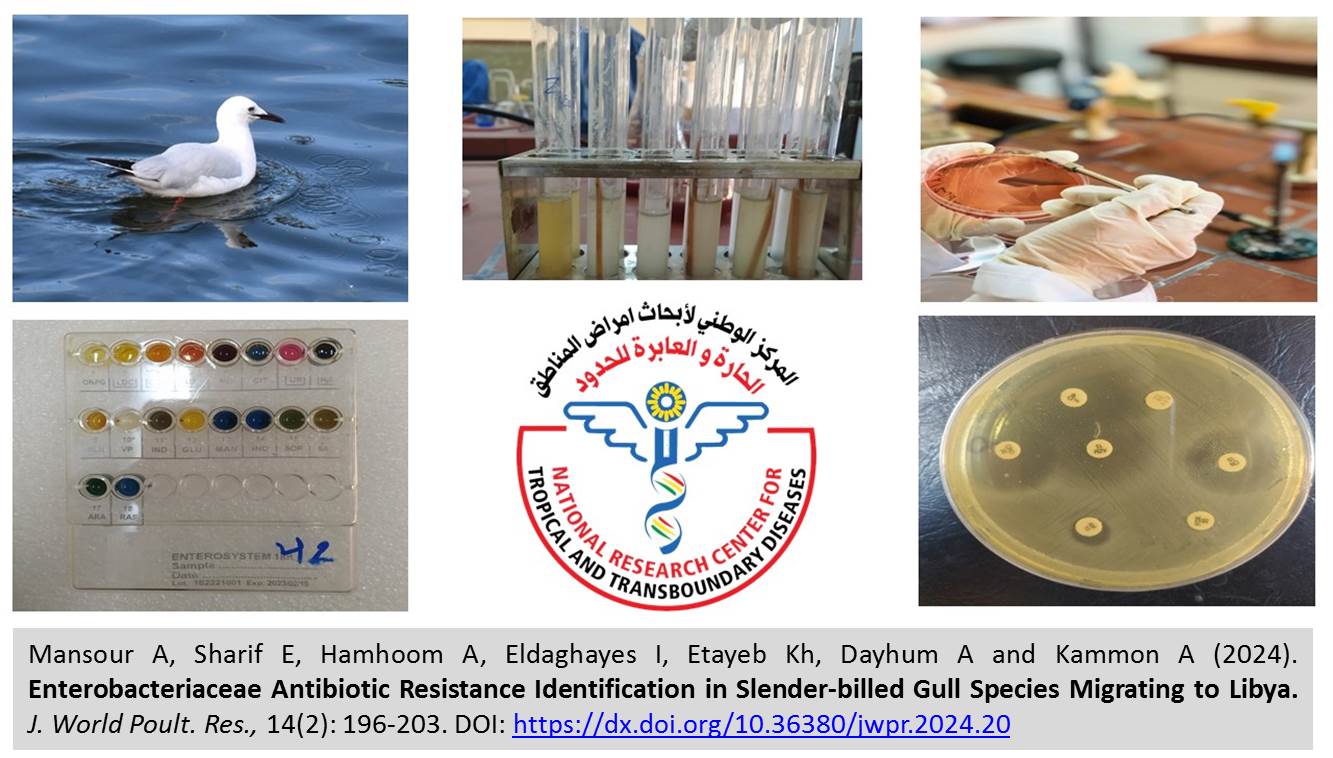 ABSTRACT: The Libyan coast has various types of wetlands that are passed by many migratory birds throughout the year, however, studies on bacterial isolation from these birds in Lybia are scarce. The present study aimed to isolate enteropathogenic bacterial species from the seagulls that migrated to the Libyan coast as well as identification of the antibiotics that are resistant to these bacteria. A total of 50 fresh fecal samples were collected from slender-billed gulls in January 2023 at Farwa Island near the city of Zuwara, in Western Libya. Bacteria were isolated by conventional culturing method, identified using the Enterosystem 18R, and antibiotic susceptibility tests were conducted on the isolated bacteria. The results revealed the isolation of 46 bacteria, but only 32 of them were identified using biochemical tests. These identified bacteria belong to six species of Enterobacteriacae, namely Citrobacter (C.) freundii, Pantoea (P.) agglomerans, Escherichia (E.) coli, Enterobacter (En.) cloacae, Serratia liquifaciens, and Proteus mirabilis, with percentages of 53.125%, 31.25%, 6.25%, 3.125%, 3.125%, and 3.125%, respectively. All isolated bacteria were 100% sensitive to gentamicin (10 µg) and ciprofloxacin (5 µg). The highest resistance result was observed against the antibiotic cefoxitin (30 µg), with both C. freundii (5 samples) and P. agglomerans (4 samples). Resistance was observed in 5 samples of C. freundii and 4 samples of P. agglomerans out of 11 samples. Resistance to antibiotics, such as azithromycin (15 µg), ceftriaxone (30 µg), and ampicillin (10 µg), was also noted in a few isolates. The results indicated that C. freundii was the most antibiotic-resistant bacterial species isolated in this study. The highest multiple antibiotic resistance index was demonstrated by bacteria C. freundii, P. agglomerans, and En. cloacae, with a value of 0.33 for each of them. In conclusion, slender-billed gulls carry multi-drug-resistant bacteria. The study recommends the implementation of a national program to survey antibiotic-resistant bacteria, determine their prevalence, and assess the presence of antibiotic residues in animal-derived food. Furthermore, the present study advises expanding scientific studies on risk analysis, and antibiotic alternatives in migratory birds.