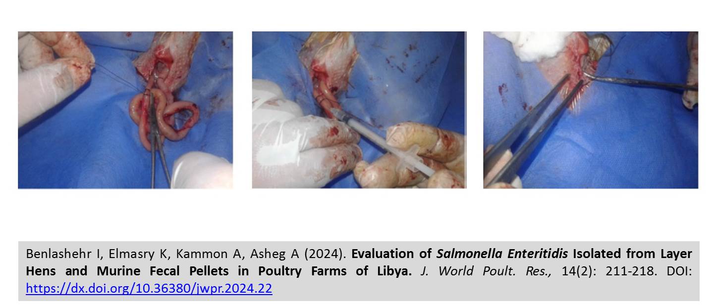 ABSTRACT: The rodents play a significant role in the transmission of Salmonella between farms and regions. The present study aimed to compare the virulence of Salmonella enteritidis isolated from fecal samples of laying hens and murine within the same poultry house but different regions in Libya using Vivo-quantitative measurement of invasiveness (chicken intestinal loop model). A total of 540 cloacal swabs from laying hens (Hy-line brown chickens) aged 36 weeks and 200 batches of murine fecal pellets were collected from the same poultry house at Gaser Bin Gisher and Furnag regions in Libya. The samples were passed on pre-enrichment broth (Buffered Peptone Water) and enrichment broths (Rappaport Vassiliadis, Selenite broth, and tetrathionate), then the samples were cultured onto Xylose Lysine Deoxycholate agar, brilliant green agar, Salmonella Shigella agar, and Hektoen enteric agar. Single colonies were selected and stained by gram stain and tested biochemically using analytical profile index (API) 20 tests. Salmonella enteritidis was isolated from all the collected samples. The invasion of Salmonella enteritidis isolated from laying hens and murine feces was significantly higher in the anterior inoculation position compared to the posterior position of jejunum in both regions. The account of Salmonella enteritidis isolated from laying feces of hens and murine at Gaser Bengasher region was significantly higher than that isolated from the AlFurnge region. In the present study, the rodents act only as mechanical transmitters without affecting Salmonella invasiveness capacity. Furthermore, the invasion of Salmonella enteritidis depends on the inoculation position in the jejunum. Moreover, the invasiveness variation of Salmonella enteritidis isolated from the Gaser Bengasher and AlFurnge regions could be attributed to the presence of different Salmonella strains in the studied area. Salmonella enteritidis isolated from poultry and murine in the current study was sensitive to gentamicin, ciprofloxacin, and enrofloxacin and resistant to doxycycline, chloramphenicol, sulfafurazol, and ampicillin.